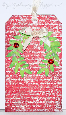 Взяла акварельную бумажку, затонировала подушечками 3-х цветов (красный, красно-бордовый и черный). С помощью фонового штампа и белой пудры сделала эмбоссинг (как я люблю эту технику, до сих пор расплавление пудры для меня волшебное действо). Фон получился волшебный, очень понравился. Венок сделала из дырокольных листтиков